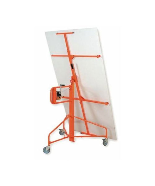A simple winch operated lift for positioning plasterboard, prior to fixing.
